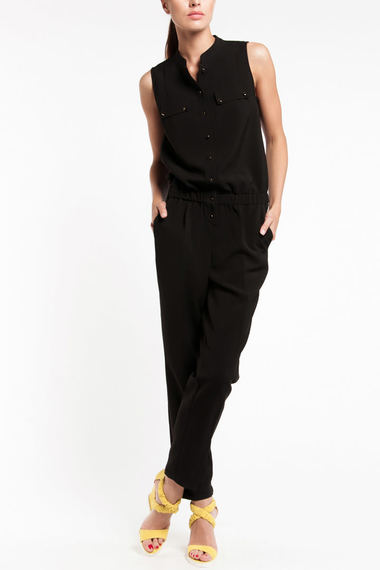 ОписаниеСтильный комбинезон черного цвета! Модель из шелковистой ткани, с длинными штанинами, пояс на резинке, без рукавов, застегивается на пуговицы.